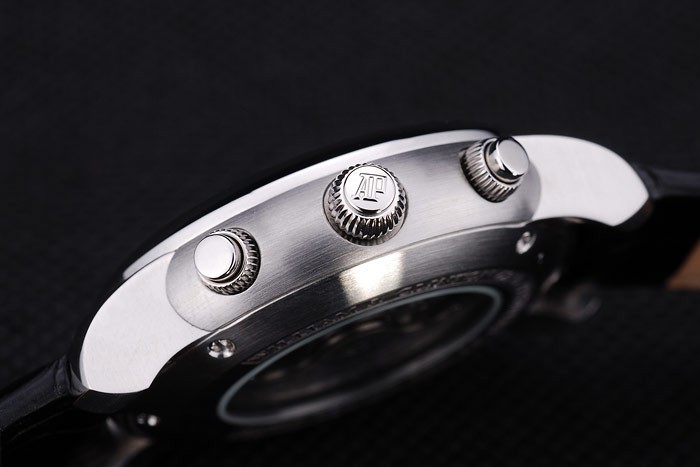 Crown: Stainless steel cutwork crown with Audemars Piguet logo and two smaller push-button crowns on either side of it