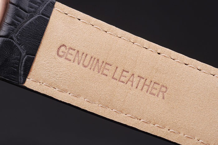 Bracelet: Black crocodile leather strap with heat embossed Audemars Piguet name and logo and an Audemars Piguet inscribed 18k rose-gold plated flip-over hook clasp