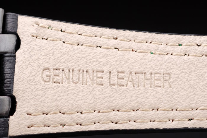 Bracelet: Heat embossed Audemars Piguet black crocodile leather strap with double green stitching and Audemars Piguet engraved ion-plated fold-in clasp