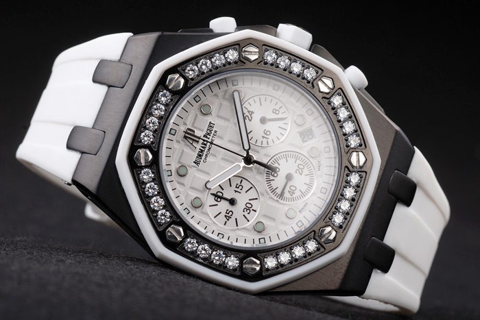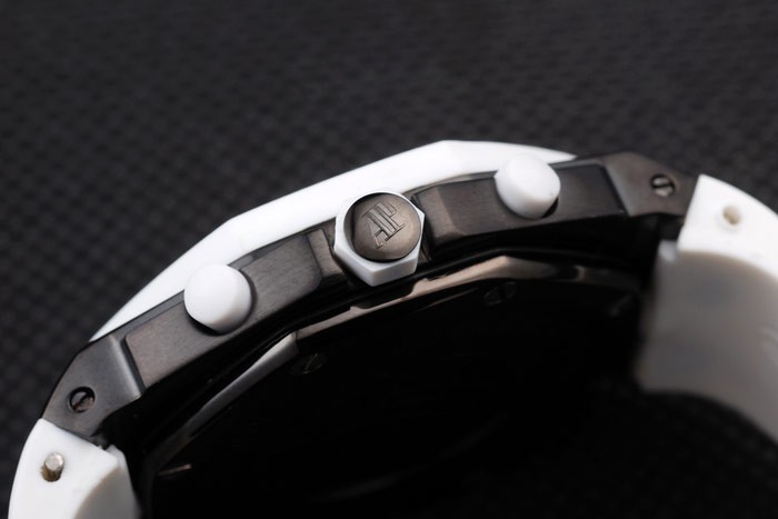 Crown: White rubber hexagonal crown with the initials AP on stainless steel stud plus a white round rubber crown on either side of it