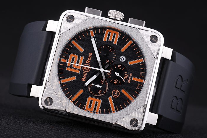 Bracelet: Heat embossed Bell & Ross logo and product code black rubber strap with BR inscribed brushed stainless steel hook-buckle clasp