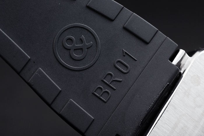 Bracelet: Black rubber strap with heat embossed logo, model number and product code and BR engraved brushed stainless steel hook-buckle clasp