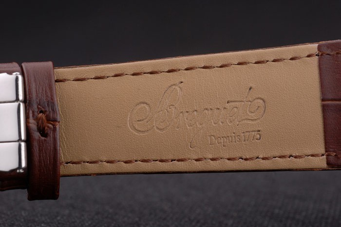 Bracelet: Breguet heat embossed brown crocodile leather strap with Brequet engraved polished stainless steel fold-in hook-buckle clasp