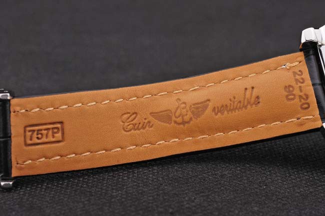 Bracelet: Black high-grade leather in a crocodile pattern, with heavy white cotton stitching. Tan inner band is embossed with the Breitling name and logo, and has a steel buckle closure.