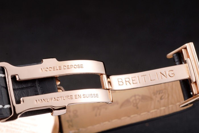 Bracelet: Black crocodile leather strap with patent white stitching and heat embossed Breitling engravings and engraved 18k yellow gold plated fold in clasp with Breitling logo on top