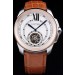 Bracelet: Heat embossed Cartier stamped light brown crocodile leather strap with brushed stainless steel hidden clasp