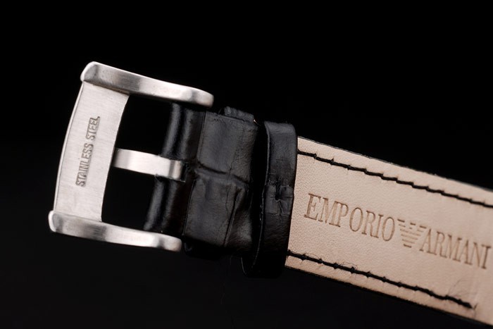 Bracelet: Emporio Armani heat embossed black crocodile leather strap with Emporio Armani and logo engraved brushed stainless steel hook-buckle clasp