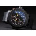 Crown: Cutwork ion-plated crown with 'H' engraving and two rectangular push-button crowns on either side, studded with black and red rubber trimmings