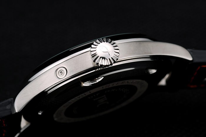 Bracelet: IWC heat embossed black crocodile leather strap with orange thread stitching and IWC engraved brushed stainless steel hook-buckle clasp