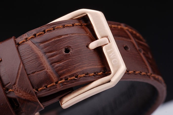 Bracelet: Brown crocodile leather strap with IWC inscribed rose-gold hook-buckle clasp