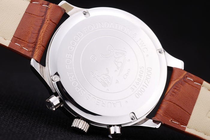Crown: Polished stainless steel cutwork crown with IWC logo engraving and two smaller round push-button crowns on either side of it