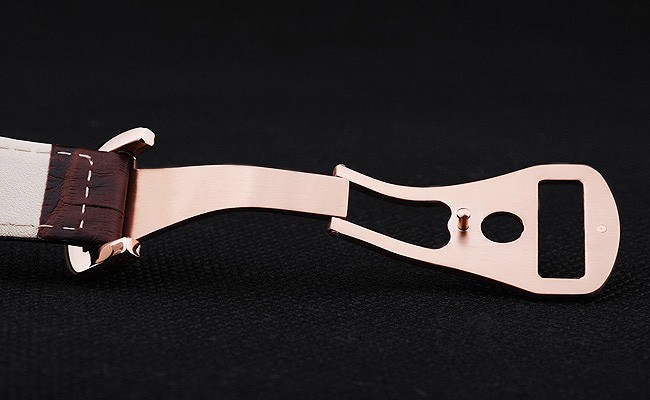 Bracelet: Brown crocodile leather strap with white stitching and Omega logo engraved rose gold hook-buckle clasp