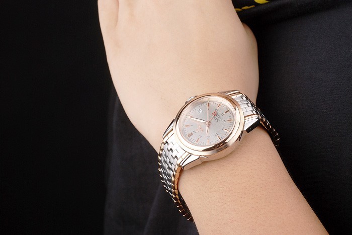 Back: Stainless steel push-in case back with Omega inscriptions and transparent centre that reveals the mechanics within