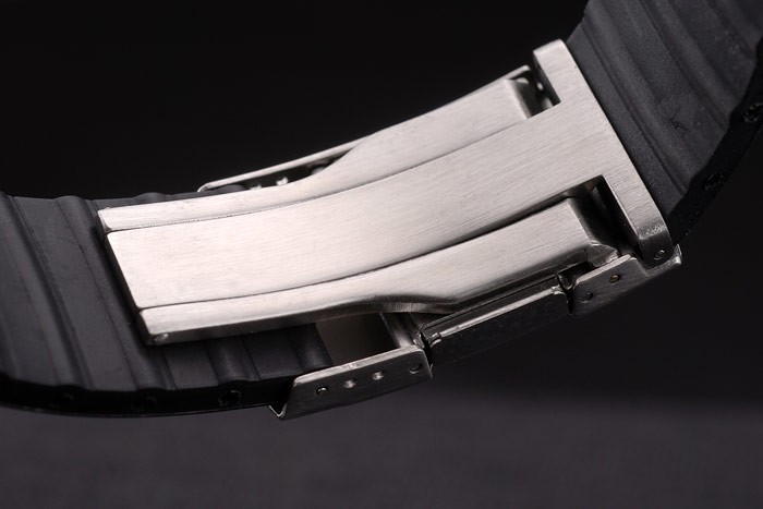 Bracelet: Oris heat embossed black rubber strap with Oris engraved brushed stainless steel deployment clasp