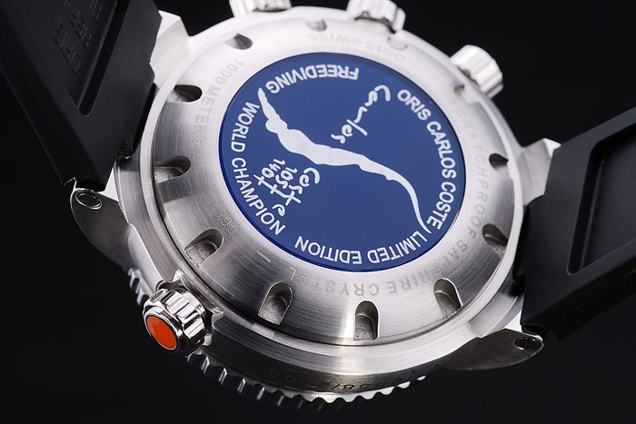 Back: Stainless steel snap-in back with blue enamel Oris Carlos Coste Limited Edition inscription and logo
