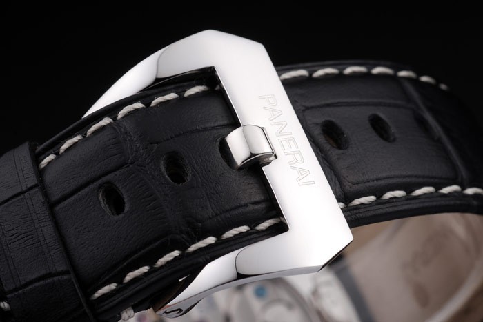 Bracelet: Black crocodile leather strap with white stitching and heat embossed Officine Panerai Italy stamp and polished stainless steel hook-buckle clasp with Panerai engraving