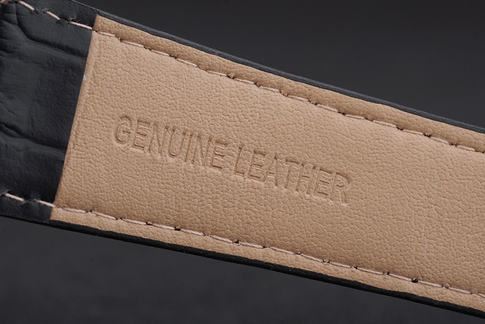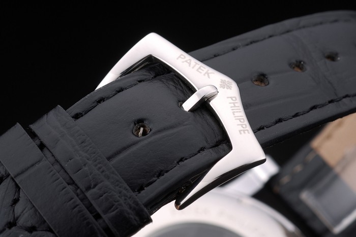 Bracelet: Black crocodile leather strap with heat embossed Patek Philippe stamp and polished stainless steel hook-buckle clasp with Patek Philippe engraving