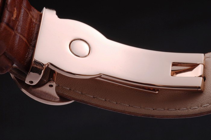 Bracelet: Brown leather strap with Patek Philippe stamp and a rose gold fold in clasp and a Patek logo buckle