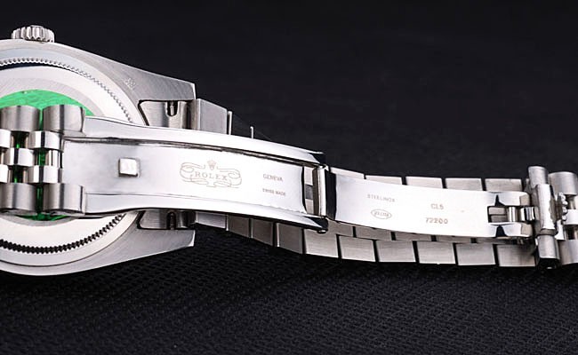 Back: Stainless steel push-in case back with green Rolex logo stamp