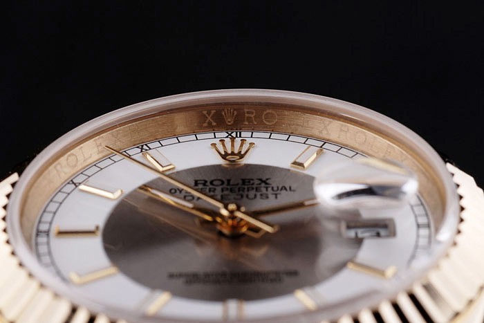 Crown: 18k yellow gold plated steel cutwork crown with Rolex logo