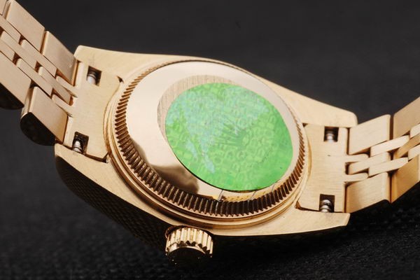 Back: Push in 18K yellow gold back with green Rolex sticker and markings