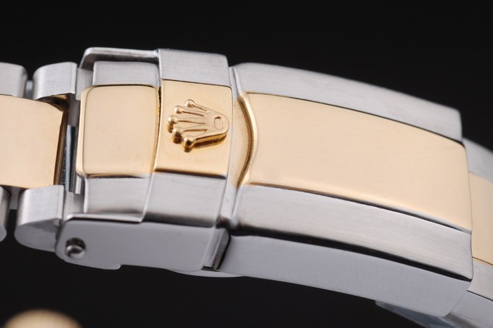 Bracelet: Two toned brushed and gold tone stainless steel link bracelet with Rolex engraving deployment clasp displaying the Rolex logo