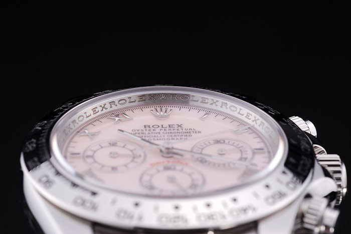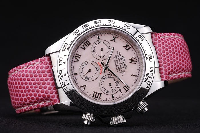 Bracelet: Pink snake leather strap with Rolex and logo engraving and stainless steel deployment clasp displaying Rolex logo
