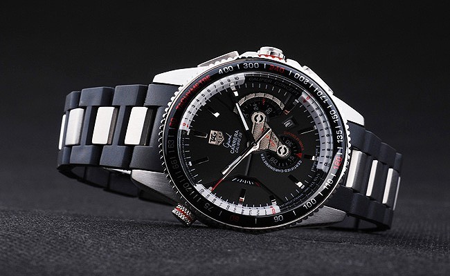 Crown: Polished stainless steel cutwork crown with Tag Heuer logo plus two additional crowns on either side and one on the opposite top corner