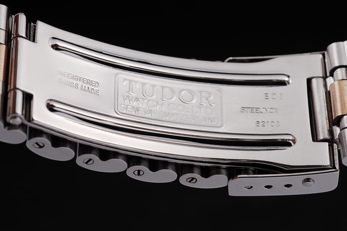 Bracelet: Two toned brushed stainless steel and yellow gold plated link bracelet with Tudor engravings and push-release fold-over clasp with Tudor logo on top
